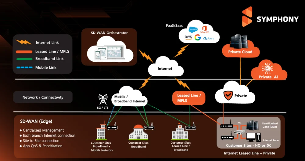 In the current landscape of Digital Transformation, businesses are increasingly dependent on Cloud Computing and high-speed, seamless connectivity. Managing a complex network infrastructure between headquarters and multiple branches has become a mission-critical priority. SYMPHONY SD-WAN Solution is engineered to simplify your Wide Area Network (WAN) management, ensuring it is not only easy to operate but also fortified with maximum security and optimized for peak efficiency.
